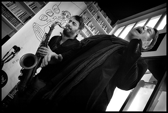 Dans cette entrée glaciale qui nous tient éveillés, les mots se succèdent, lentement ou violemment, se chuchotent, se répètent, rencontrent les dessins qui passent d’un mur à un autre dans la recherche d’une harmonie visuelle maximale. L’ombre du saxophone de Francesco plane sur ces créations visuelles à la recherche de leur juste place. Je ne peux pas faire de photos de cette ombre puisque je joue, mais elle est filmée.