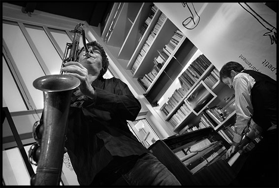 Sunday jazz loft musicien Francesco Bearzatti saxophone saxophoniste clarinette clarinettiste Franck Avitabile pianiste piano photo noir et blanc reportage concert jazz dessin kakemono