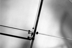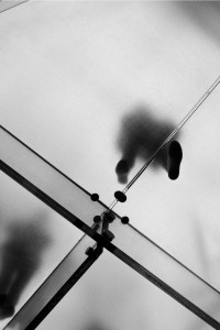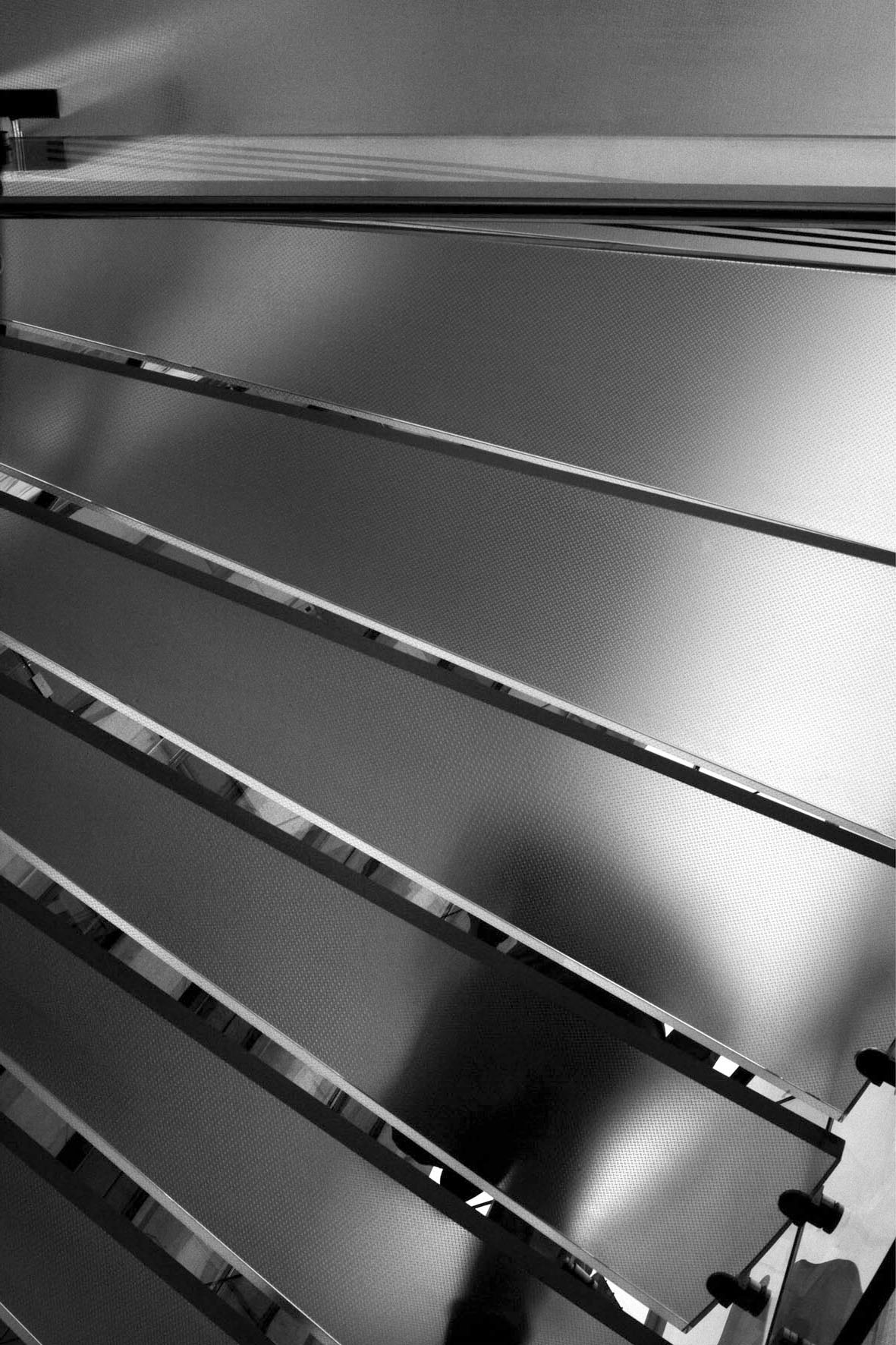 Petit à petit je bascule dans un état second. Enivré par ces mouvements en continu, j’appuie sans m’arrêter, sans arriver à m’arrêter. Je distingue des dessous d’escarpins, de godasses, de mocassins. J’entrevois une personne qui attend son compagnon, une autre qui hésite, qui fait marche avant, marche arrière, puis une autre avec une mallette, avec une chaise roulante, une poussette, un vélo et je ne sais plus quoi d’autre tellement les images vont vite. Et tout recommence. Un groupe arrive, prend les escaliers, je les suis du viseur, j’appuie encore. D’autres personnages empruntent l’ascenseur, je ne m’épuise toujours pas. Je déclenche encore et encore. Cette transparence me parle, me donne à imaginer, m’envoûte et m’entraîne dans cette réalité transformée où j’essaye de traduire mon ressenti sans réellement y parvenir. L’image regardée n’est déjà plus. Comment transcrire avec des images fixes ce vertige de pieds qui apparaissent et disparaissent ? Je ne pense pas à filmer, juste à photographier, en noir et blanc, en continu. J’appuie et j’appuie encore. Je joue avec la découpe des marches comme avec celle des dalles en verre qui, à leur tour, jouent leur rôle de passerelles entre la rue et la cage d’ascenseur. Rectangles entrecoupés de pieds, découpes horizontales et verticales, semelles de chaussures noires qui se grisent dans le mouvement. J’attrape tout ce que je peux.