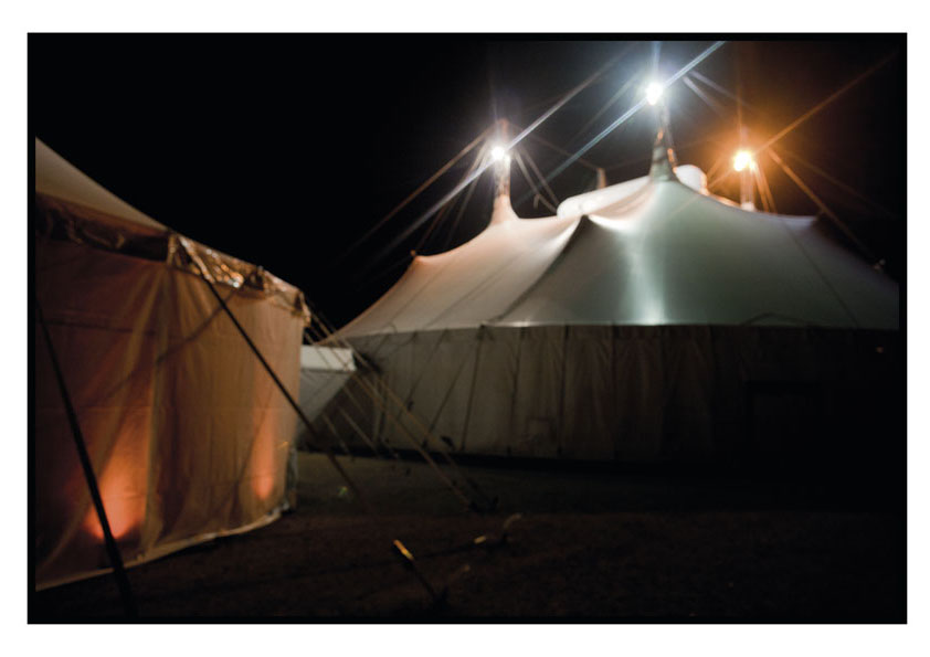 Sous les chapiteaux successifs que j’ai pu approcher, j’ai rencontré un cirque unique à facettes multiples. Il ne m’a jamais quitté. Une piste au repos, dans l’obscurité, avant sa mise à nu, une fois, deux fois, trois fois dans la même journée. Des hommes aux personnalités diverses, toujours en action, toujours en mouvement. Un mensonge sur-joué fait de bouts de vrai, de beautés cachées, de tristesses transcendées, de maquillages paillettes, de clowns bouche-trous… Trapézistes angoisses, dompteurs peurs, magiciens ratés, chevaux élégants ou éléphants majestueusement potiches se mélangent à une fumée poussière afin de devenir voyage à la découverte de contrées réinventées. Montage, cage, musique, accessoires, entr’acte, démontage, fin de l’histoire. Tout se dit dans les coulisses d’une roulotte. Tout se transforme devant le public, dans les cris assourdissants d’enfants aux yeux ronds d’étonnement et aux éclats de rire sans jugement, dans le comportement de parents apeurés par leur enfance disparue. Mais mon cirque, c’est aussi celui qui se trouve au croisement imaginaire de ma culture familiale et de mes aventures fantasmées de voyageur reporter, la musique yiddish flirtant avec la musique tsigane, ou le rêve de contrées éloignées s’incarnant dans le mode de vie des gens du voyage. Passant de troupes en troupes, je les écoute jouer leur partition. Dans le public puis dans les coulisses, je cherche à saisir leurs raisons d’être ces hommes, sans autre attache que leurs numéros d’un soir ou d’une après-midi. Dans l’ombre j’inscris mes émotions visuelles sur ma pellicule virtuelle et je pose mes ressentis instantanés dans mon cahier zapbook, spécial poésie quotidienne.