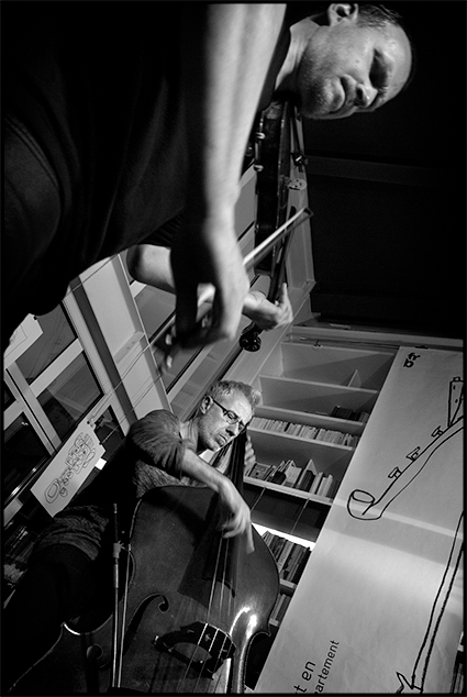 11e Sunday jazz loft musicien photo noir et blanc reportage concert jazz Bruno Chevillon contrebassiste contrebasse Régis Huby violoniste