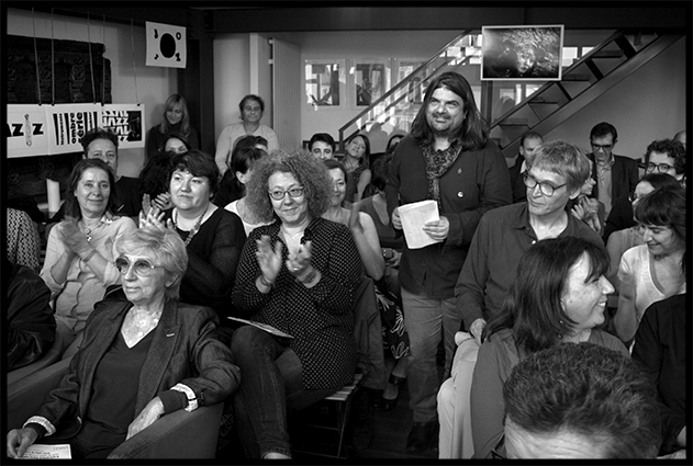 12e Sunday jazz loft noir et blanc photo image reportage concert en appartement Jean-Pierre Como pianiste spectateur