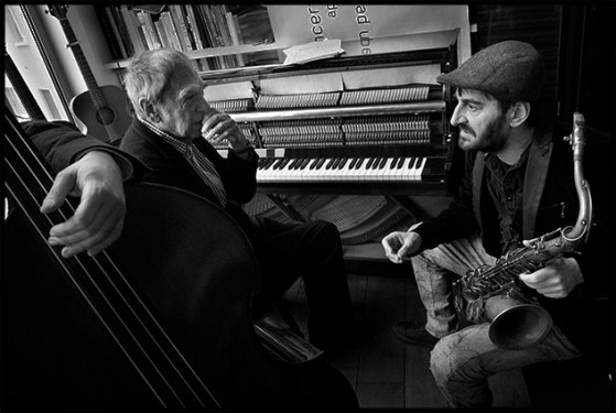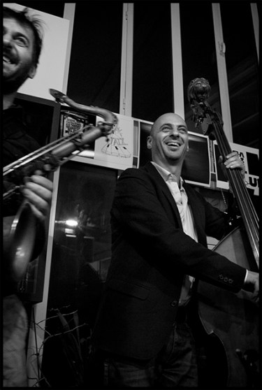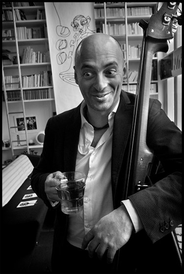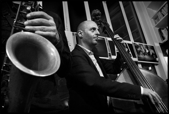 Mauro Gargano, les doigts crochetant les cordes de sa basse noire, à tête de lion, n’était pas non plus présent au milieu de ces jeux musicaux aux échanges huilés par des répétitions inexistantes. Mauro, cet homme avec qui j’ai réalisé il y a quelques années une balade musicale dans les stands d’un salon de photo en Belgique, lors d’une des premières expressions visuelles du projet plurimedia « Et si le jazz est la vie », c’est sans doute moi qui l’ai imaginé entre le pianiste et le saxophoniste.
