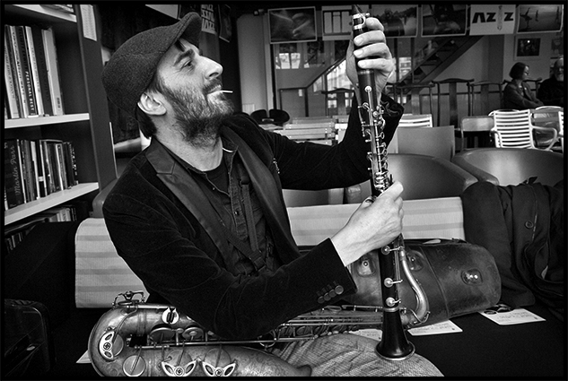 15e Sunday jazz loft concert en appartement photo noir et blanc reportage lecture poésie Francesco Bearzatti dimanche saxophone tenor clarinette canapé
