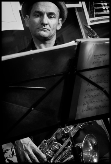 François Petavy, sax tenor amateur, s’est fondu à merveille dans un dialogue à trois sax, avec une joie intense faisant vibrer tout son corps en mouvement.