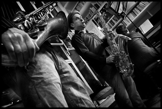 Voilà maintenant qu’Elia sort de derrière la caméra et se place au centre de ce qui sert de scène sans estrade. Il est seul, face public. Dans sa décontraction d’ado cool, il nous expose avec un humour décapant qui n’appartient qu’à cette jeunesse qui ne lui passera peut-être jamais, sa perception critique des Sunday jazz loft. Il croque au vitriol amical chacun des personnages clés de nos rendez-vous dominicaux. Les habitués rient, les nouveaux aussi.