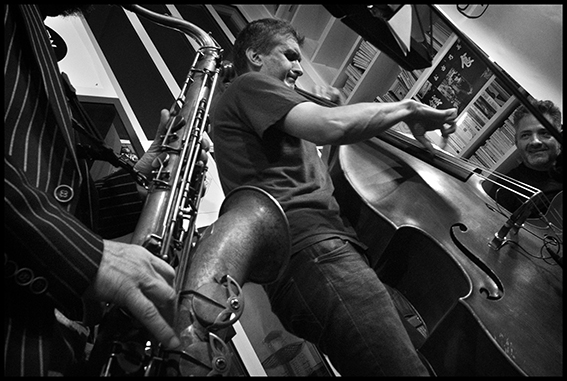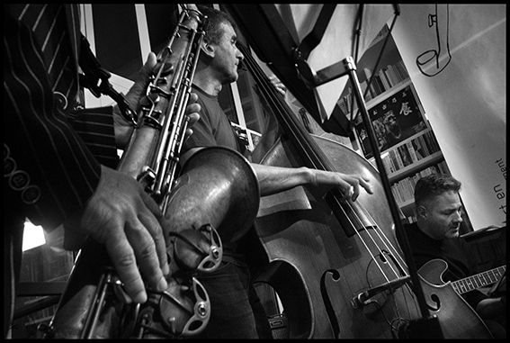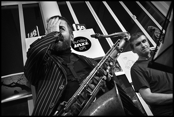 Rituels qui nous ont entraînés dans “Le” Sunday jazz loft, de notre plein gré, chevauchant la guitare électrique de Chester Harlan, aussi rouge que calme, se reposant tout contre basse de Sava Medan, le regard au loin et les doigts courant sur ses cordes, se déposant au creux de l’arrondi du sax de Francesco Bearzatti. Sax qui parfois se transforme discrètement en clarinette, toujours plus sautillante de plaisirs.