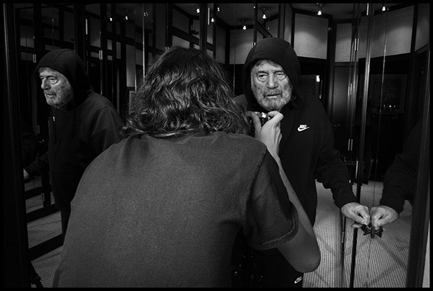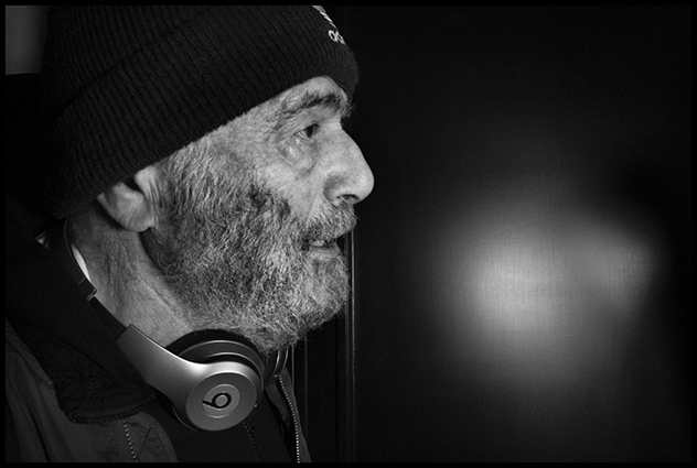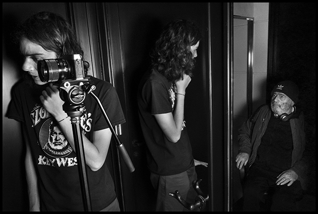 Un petit-fils guidant son grand-père en vrai, en vrai directeur d’acteur, dans le rôle de fiction d’un grand-père barbu en pellicule et en tenue de djeuns, pour la circonstance de ce tournage tous âges confondus et accoutrements à périmètres variables, casque de ’sique, bombers et bonnet dans le vent d’un intérieur sombre.