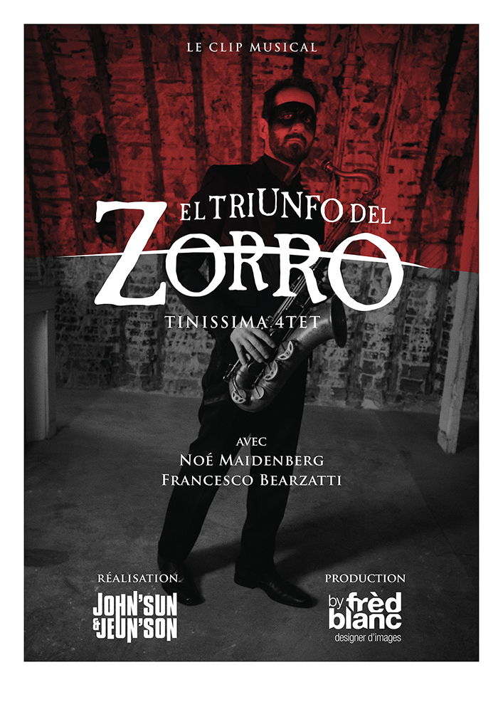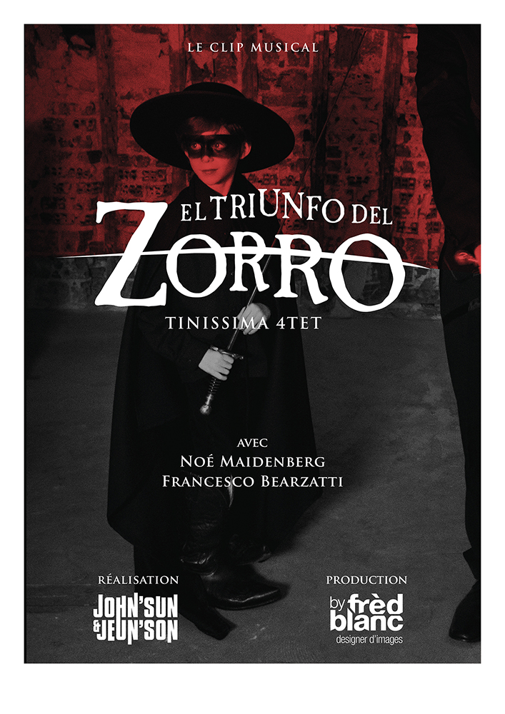 Le jazz m’a même poussé à réaliser une affiche de Zorro en 2021, non pas pour un film, mais pour illustrer le clip vidéo d’une musique de l’album Zorro, la dernière bio musicale conçue par Francesco Bearzzati et interprétée par son groupe le Tinissima 4Tet. Ce clip fut réalisé par “John’sun & Jeun’son,”, qui ne sont autre que mon fils Elia et moi-même. Une encore autre aventure familiale.