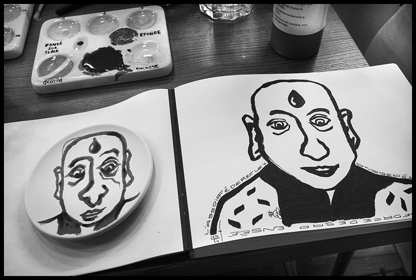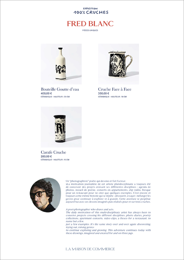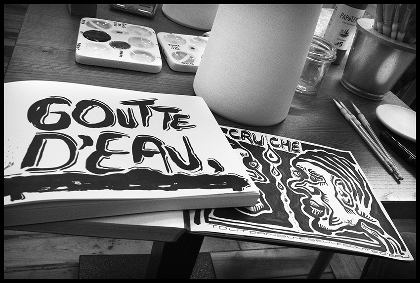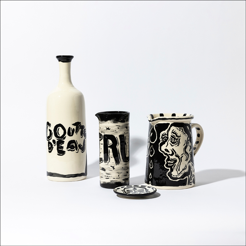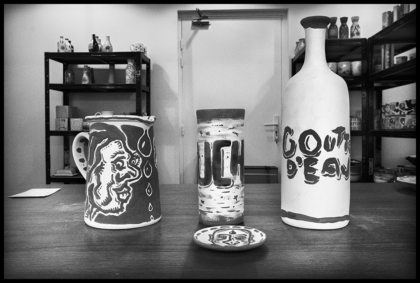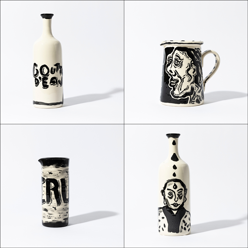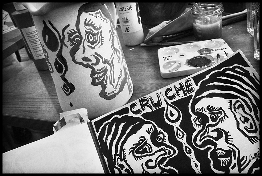 Que ce soit les quarante trois carnets de poèmes et dessins quotidiens ou une fresque pour un restaurant. C’est encore et toujours cette même histoire qui se répète ; celle de découvrir, d’essayer puis de mélanger les genres pour continuer à explorer et à grandir. Cette aventure, elle se perpétue aujourd’hui avec ce dessin qu’il a imaginé puis réalisé pour et sur une cruche.