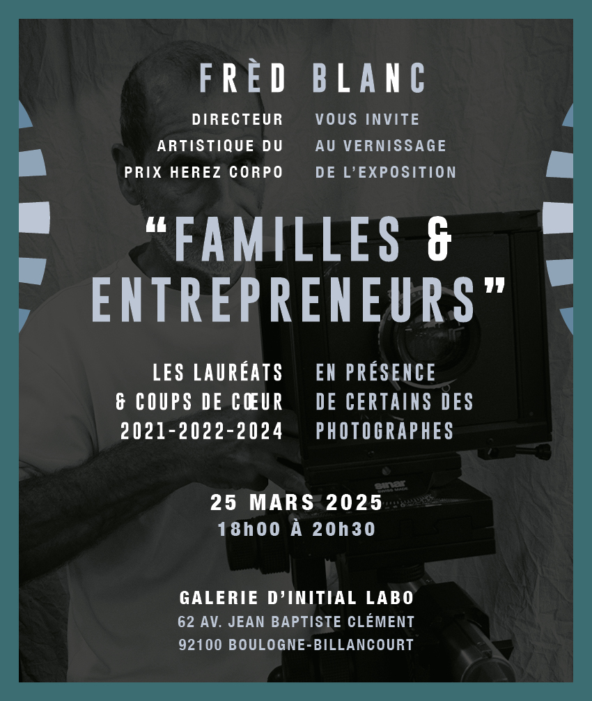 Frèd Blanc directeur artistique du #prixphoto Herez Corpo vous invite au vernissage de l’exposition, « familles et entrepreneurs”, des lauréats et coups de cœur 2021- 2022 – 2024, en présence de certains photographes. Galerie #InitialLABO, 62 Av. Jean Baptiste Clément à Boulogne.