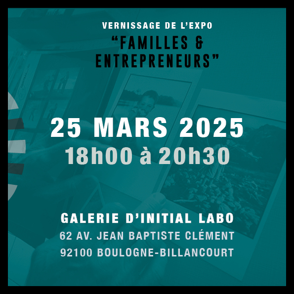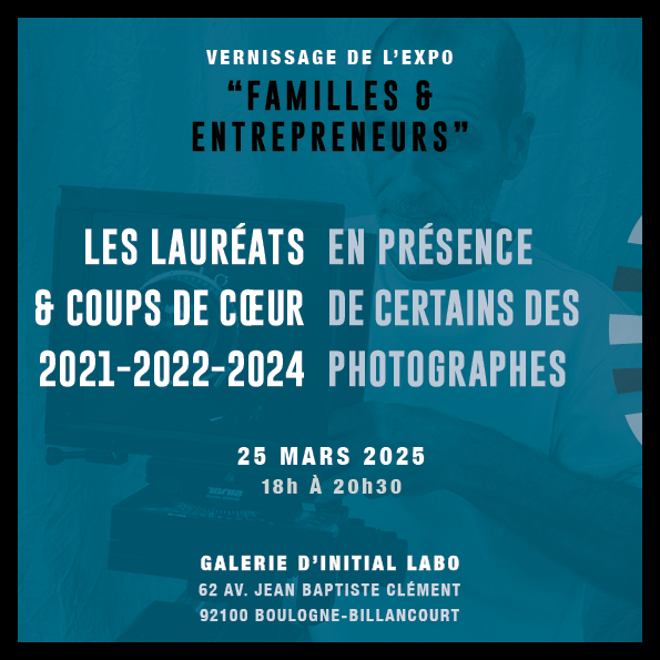 Le 25 mars 2025 dernier, le vernissage du prix a donc eu lieu dans la galerie d’Initial LABO. Dans un esprit minimaliste et sombre, où les éclairages directionnels ont mis en valeur les tirages photographique traditionnels mélangés à des tirages sur tissus ou rétro-éclairés, un public très varié c’est réuni pour découvrir les différents photographes primés et leur interprétation de la famille comme de l’entrepreneur. Commissaires d’expositions, éditeurs, créatifs, collectionneurs et photographes étaient au rendez-vous dans une ambiance décontractée où l’échange et la curiosité ont rythmés les discussions.